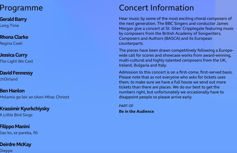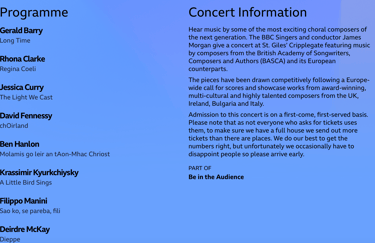 ‘In the three opening works, including the new pieces by Latvian Georgs Pelecis and Irish composer Deirdre McKay, the excellent Latvian choir was conducted by one of its own conductors, Maris Sirmais. McKay's specially commissioned Plunkett’s last words is conceived as a layered, slowly-shifting drone out of which the words coalesce and rise to intense heights’