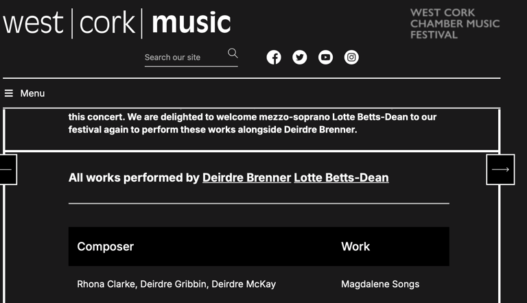 Previous commissions and performances have included works for Northern Ireland Opera, State Choir Latvija for Louth Contemporary Music, BBC Singers, Chamber Choir Ireland, the Irish Chamber Orchestra, Ulster Orchestra, Boston Firebird Ensemble, Norwegian Vertavo, Swiss Terpsycordes, Vanbrugh and RTÉ Con Tempo string quartets, Access Contemporary Music Chicago, New Music Dublin, Sound Festival, Aberdeen, RTÉ’s Composing the Island and Living Music Festivals; Musici Ireland, Dutch violist Elisabeth Smalt, Calefax Reed Quintet, Finnish pianist Antti Siirala, Chloë Hanslip & Danny Driver, Darragh Morgan & Mary Dullea, Mairéad Hickey & Fiachra Garvey, Dušica Mladenović & Ian Wilson, Catherine Leonard & Hugh Tinney, Tasmin Little & Martin Roscoe, Ruth Morley & Laura Bowler, Clíona Doris, Robin Tritschler, Concorde and the Crash Ensemble. Former Composer in Association to the Northern Sinfonia’s Young Sinfonia, Deirdre was the featured composer at the Chamber Music on Valentia Festival, 2020.